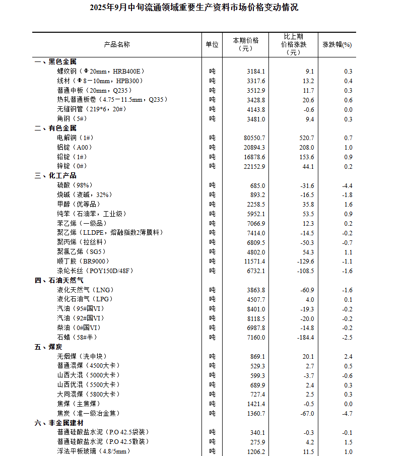 9月24日,国家统计局发布2025年9月中旬流通领域重要生产资料市场价格变动情况,据对全国流通领域9大类50种重要生产资料市场价格的监测显示,2025年9月中旬与9月上旬相比,25种产品价格上涨,23种下降,2种持平。其中,生猪(外三元)价格环比下降5.1%。